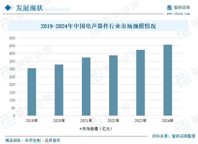 中国电声器件行业发展现状分析 近年来,我国电声器件行业市场规模逐年上涨,2019年中国电声器件行业市场规模305.30亿元,到2024年,我国电声器件行业市场规模达456.39亿元。随着消费电子、汽车工业、智能家居等下游应用领域的不断发展,对电声器件的需求持续增加。随着5G、物联网、人工智能等技术的不断发展,消费电子市场将继续保持快速增长。智能手机、平板电脑、智能穿戴设备等产品的更新换代将带动电声器件需求的持续增长。同时,随着汽车智能化和网联化趋势的深入发展,汽车电子市场对电声器件的需求将不断增加。车载音响、语音交互系统等将成为电声器件行业新的增长点。