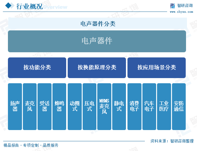 电声器件行业定义及分类 电声器件是指能够实现电信号与声波信号相互转换的电子元件,其核心功能是通过电磁、压电或静电等物理效应,完成电能与声能的双向转换。作为声学系统的重要组成部分,电声器件广泛应用于消费电子、汽车电子、医疗设备、安防监控等领域。