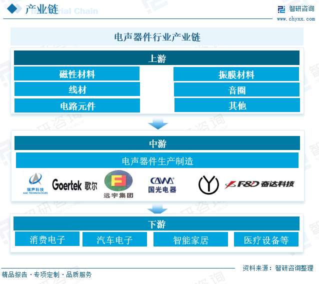 电声器件行业产业链分析 电声器件行业产业链涵盖上游原材料与零部件供应、中游电声器件制造以及下游终端应用与销售环节。上游方面,关键原材料如磁性材料、振膜材料和线材等,以及音圈、电路元件等零部件的供应,为电声器件制造提供了基础支撑。中游环节聚焦于电声器件的设计研发、生产制造与质量控制,通过技术创新和工艺优化,不断推出高性能的扬声器、麦克风、耳机等产品。下游则广泛连接消费电子、汽车电子、智能家居、医疗设备等终端应用行业,通过直接销售与间接销售渠道,将电声器件产品推向市场,满足多样化需求。整个产业链呈现出技术密集、劳动密集且市场集中度较高的特点,并正朝着技术创新、智能化和绿色环保等方向持续发展,推动电声器件行业不断迈向新的高度。
