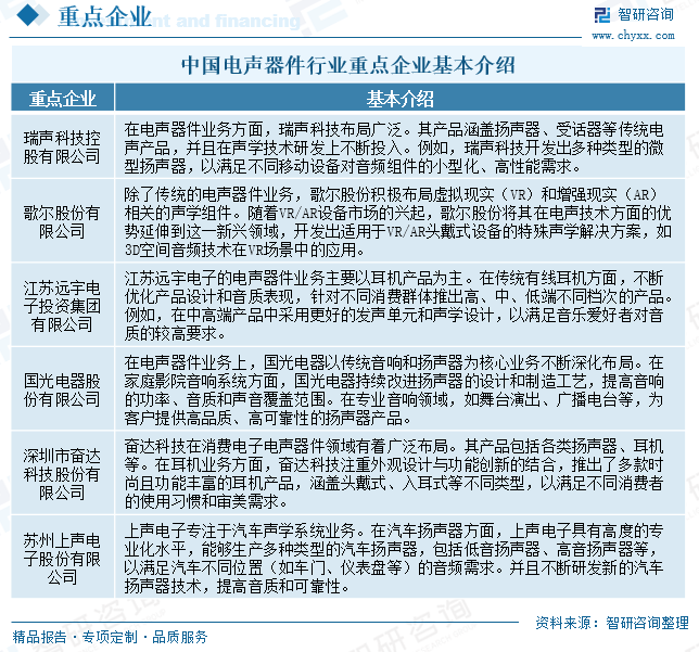 中国电声器件行业重点企业分析 我国电声器件行业企业竞争格局呈现多元化态势。瑞声科技与歌尔股份(28.480, 0.63, 2.26%)凭借在技术研发、全球市场布局以及多元化业务拓展等方面的优势,处于行业前列,它们在高端声学解决方案、新兴的VR/AR声学组件等领域竞争激烈且引领行业创新发展。江苏远宇电子、奋达科技(6.570, 0.06, 0.92%)等专注于耳机等部分电声产品领域,通过差异化产品定位和市场拓展占据一定份额,前者以耳机产品为主,在不同档次和新兴技术跟进方面下功夫,后者则将业务延伸到智能穿戴和智能家居电声产品。国光电器(14.050, 0.10, 0.72%)在传统音响和汽车音响业务不断深耕,上声电子(29.240, 0.32, 1.11%)专注汽车声学系统,在汽车扬声器和主动降噪技术方面独具优势,这些企业在各自擅长的细分领域竞争,共同构成我国电声器件行业的竞争格局。