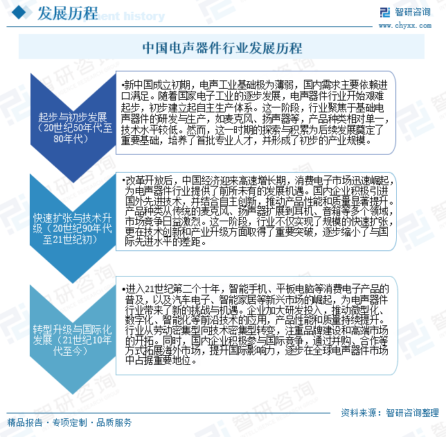 中国电声器件行业发展历程 中国电声器件行业的发展历程可分为三个阶段。起初,在20世纪50至80年代,行业基础薄弱,主要依赖进口,随着国家电子工业发展才艰难起步,初步建立生产体系,产品单一且技术水平低,但为后续发展积累了经验与人才。到了20世纪90年代至21世纪初,改革开放推动经济快速增长,消费电子市场崛起,行业迎来发展机遇,企业引进国外技术并结合自主创新,产品种类增多,质量提升,市场竞争也促使企业不断增强自身实力,实现了规模的快速扩张与技术的升级。自21世纪10年代至今,行业进入转型升级与国际化发展阶段,智能手机等普及和新兴市场崛起带来新挑战与机遇,企业加大研发投入,推动前沿技术应用,向技术密集型转变,注重品牌与高端市场开拓,还积极参与国际竞争,拓展海外市场,提升国际影响力。